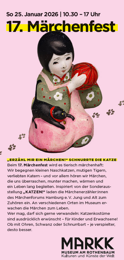 Erzählerinnen des Märchenforum Hamburg e.V. erzählen von 11 bis 17.15 Uhr zu jeder vollen Stunde Märchen an acht verschiedenen Orten im Museum (Dauer jeweils 30 Minuten). Außerdem sind Katzenmusik, eine Katzen-Performance, ein Büchertisch sowie ein Rätsel- und ein Maltisch für Kinder.